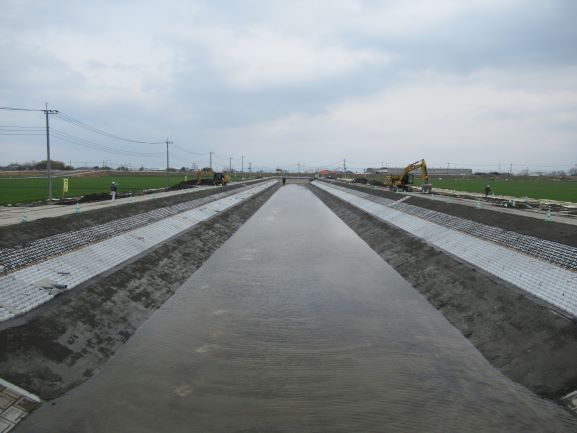 水路の両岸と水路内が綺麗に整形され、ブロックマットで法面の保護を行っています。